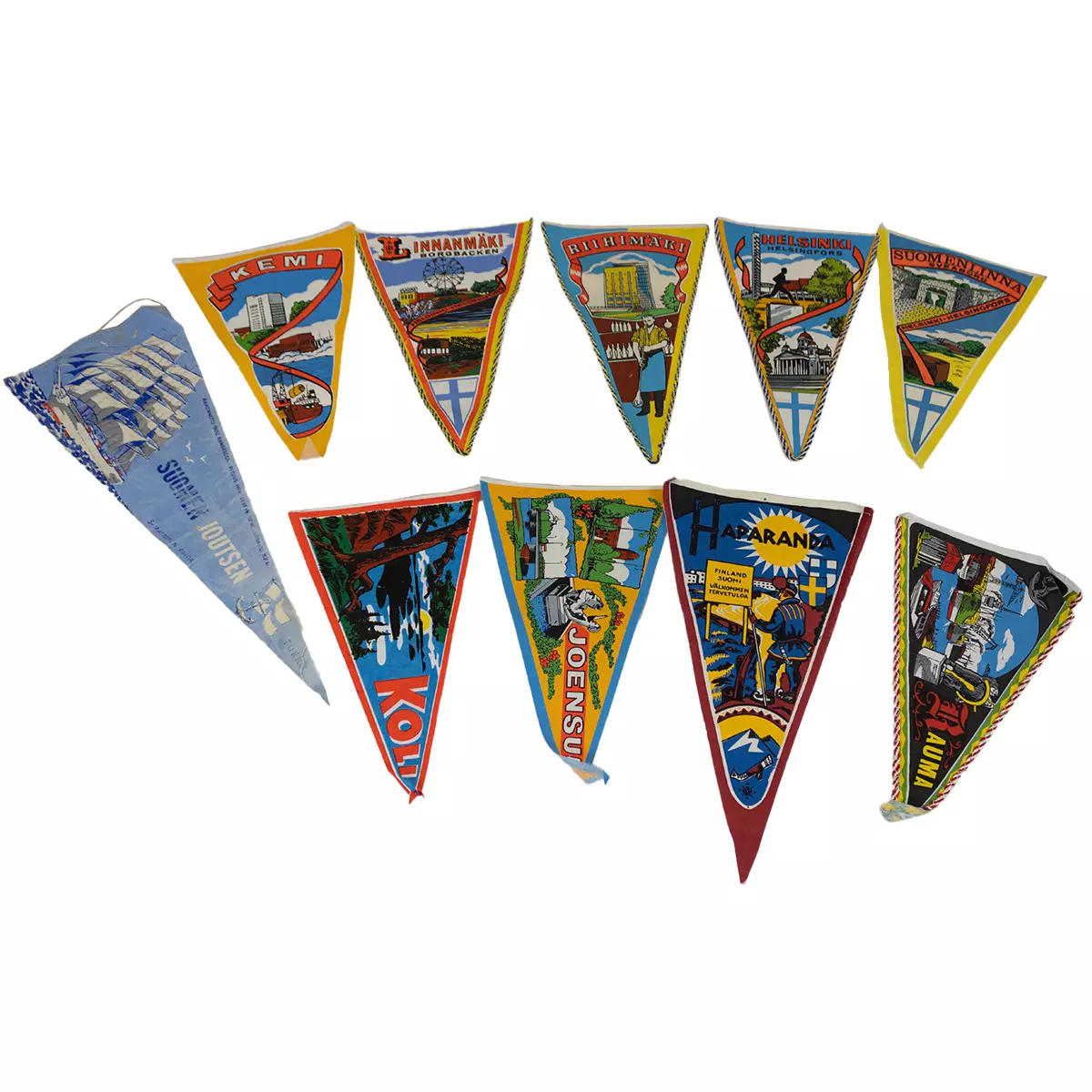 Matkailuviirejä, 10 kpl Linnanmäen, Kemin, Rauman, Kolin, Joensuun, Suomen Joutsenen, Suomenlinnan, Helsingin, Riihimäen ja Haaparannan viirit.