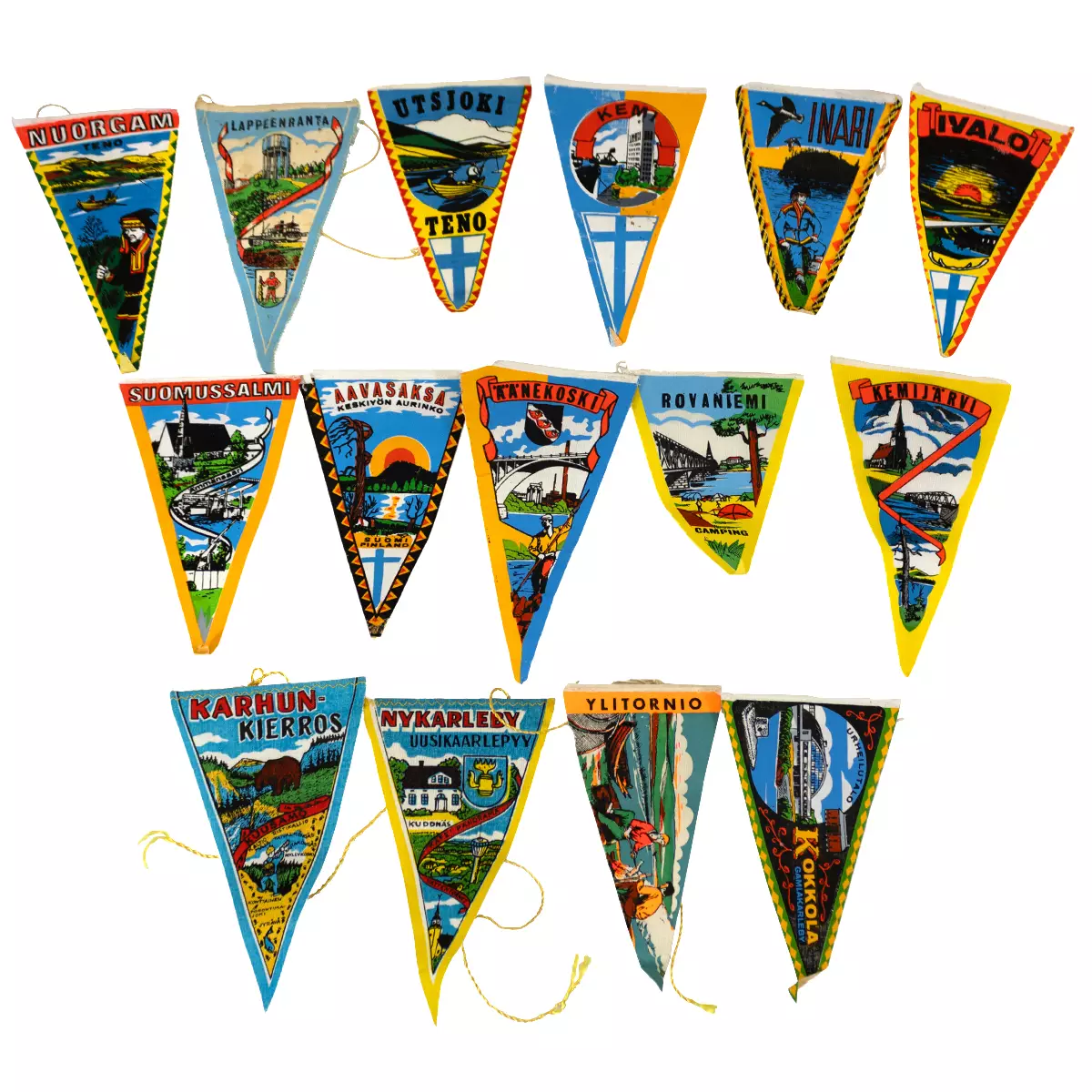 Matkailuviirejä, 15 kpl Kokkolan, Nuorgamin, Lappeenrannan, Ylitornion, Utsjoen, Ivalon, Rovaniemen, Suomussalmen, Aavasaksan, Äänenkosken, Kemin, Uusikaarlepyyn, Inarin, Kemijärven ja... Lue lisää