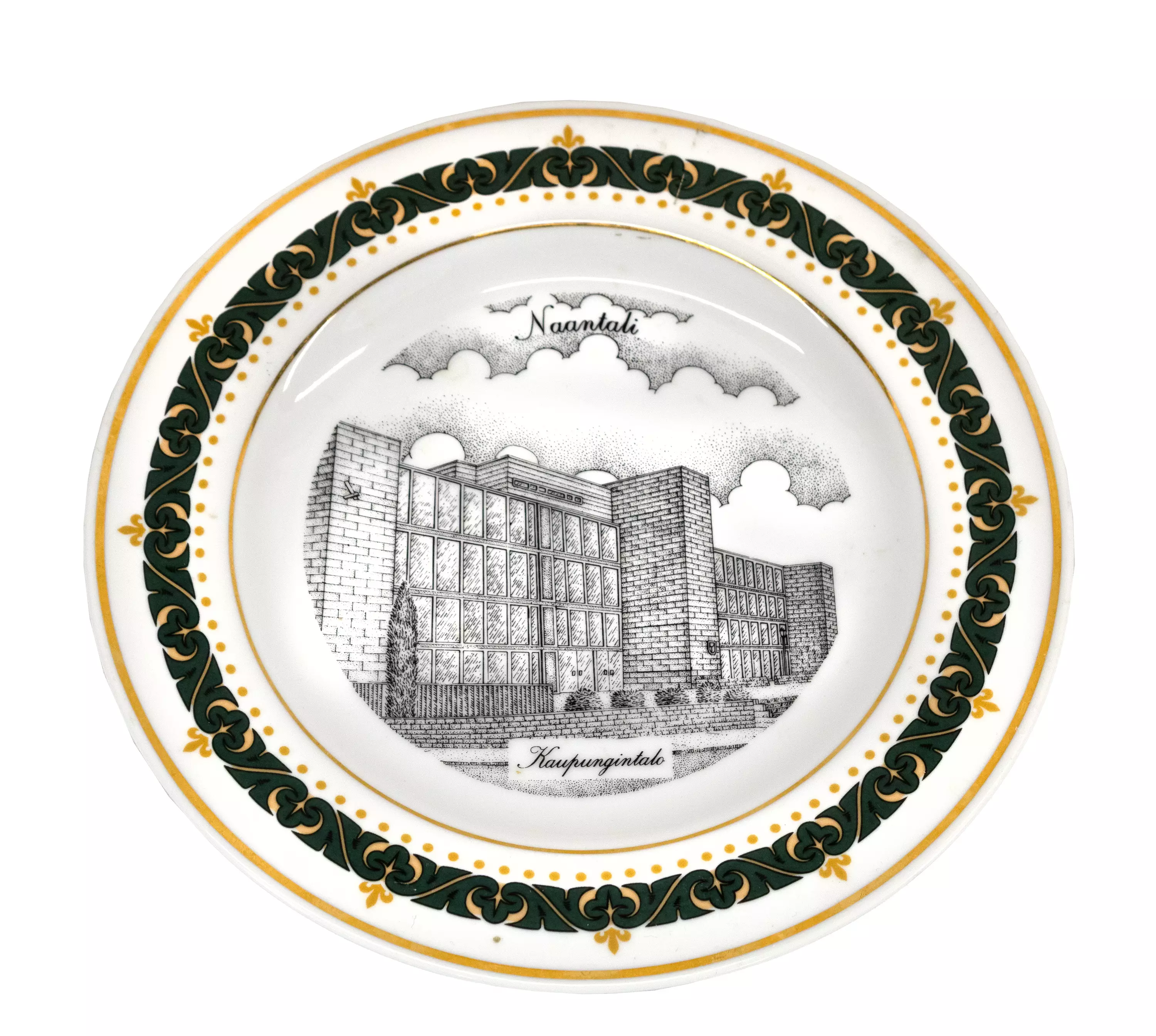 Naantali-aiheinen koristelautanen, jossa kuva kaupungintalosta.