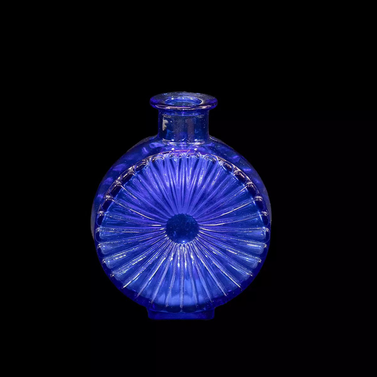 Riihimäen lasi Aurinkopullo 1/4 Suunnittelija: Helena Tynneli Tuotanto: 1964-1972 Korkeus: 12,5 cm Väri: sininen Huippu kunnossa, sisältä pölyinen.
