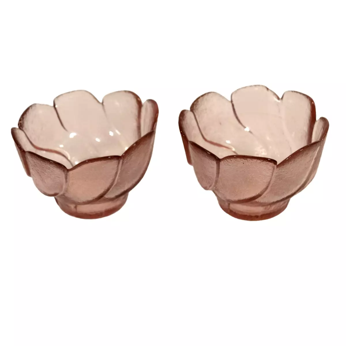 Riihimäen lasin Ulpukka-sarjan tuikkukuppeja 2kpl. Väriltään rosan sävyiset. Vuodelta 1985. Korkeus: 8cm. Halkaisija: 11cm. Ei tarroja.