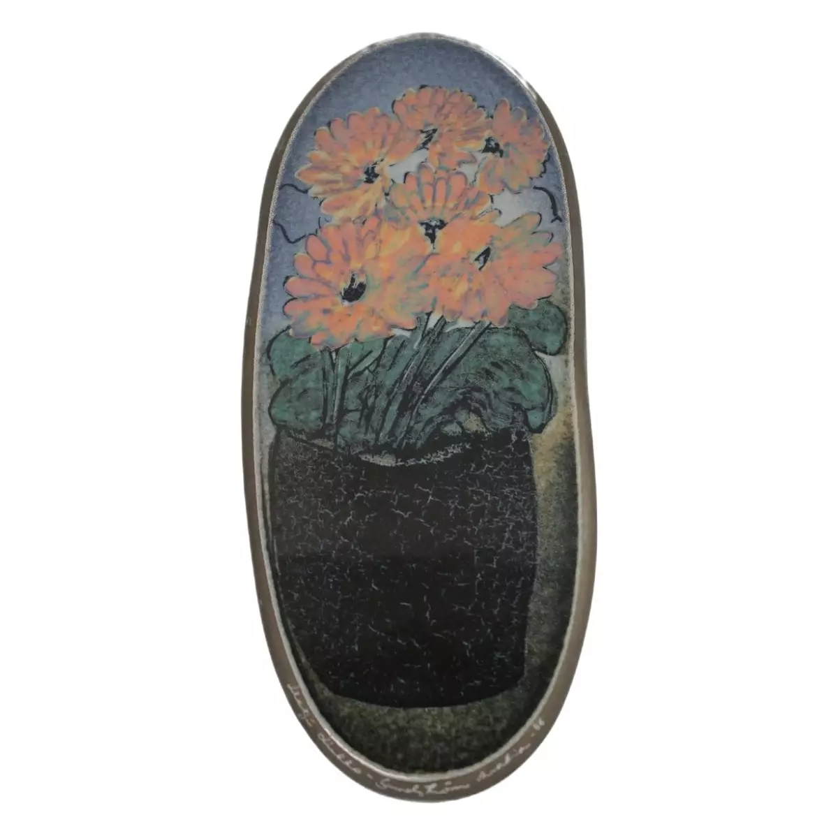 Seinälaatta "Kehäkukat" taulu Tekijä: Heljä Liukko-Sundström/ Arabia 1986 Korkeus: 32cm Halkaisija: 13cm Puuttuu, kiinnike millä saa seinään