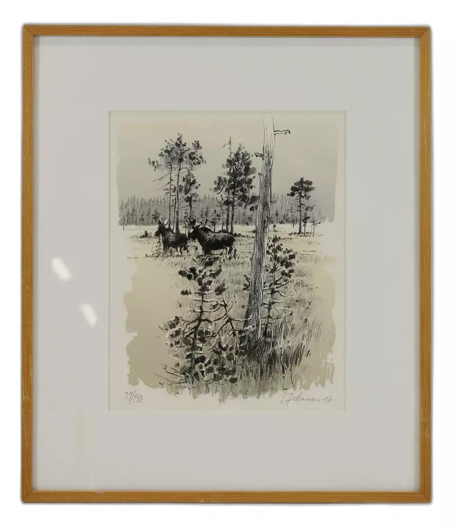 Seppo Polameren tekemä grafiikka teos hirvi teemalla. Painos 39/150 vuodelta 1987.