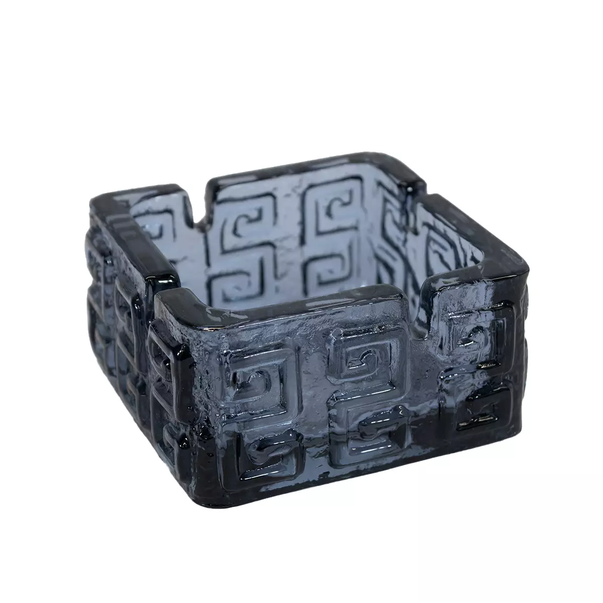 Lasinen tuhkakuppi. Valmistaja: Riihimäen lasi Suunnitellut: Tamara Aladin Valmistusvuosi: 1968-1975 Tummansininen/harmaa Halkaisija: 11cm Korkeus: 7cm