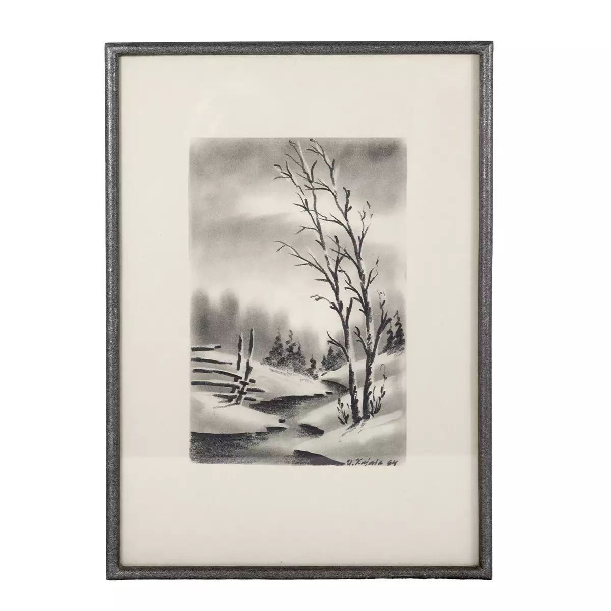 U. Kujalan vuonna 1964 signeeraama talviaiheinen taideteos kehyksissä Taiteilija: U. Kujala Vuosi: 1964 Tyyli: mustavalkoinen Aihe: talvimaisema