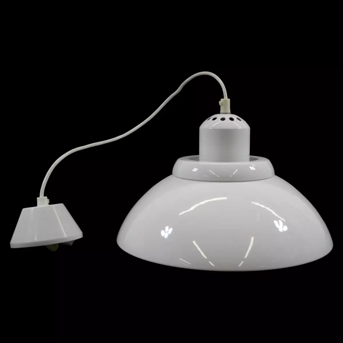 Valkoinen metallista valmistettu riippuvalaisin. Halkaisija: 35cm Korkeus: 20cm Johdon pituus: 50cm MAX 60W Valaisin on tarkistettu toimivaksi.