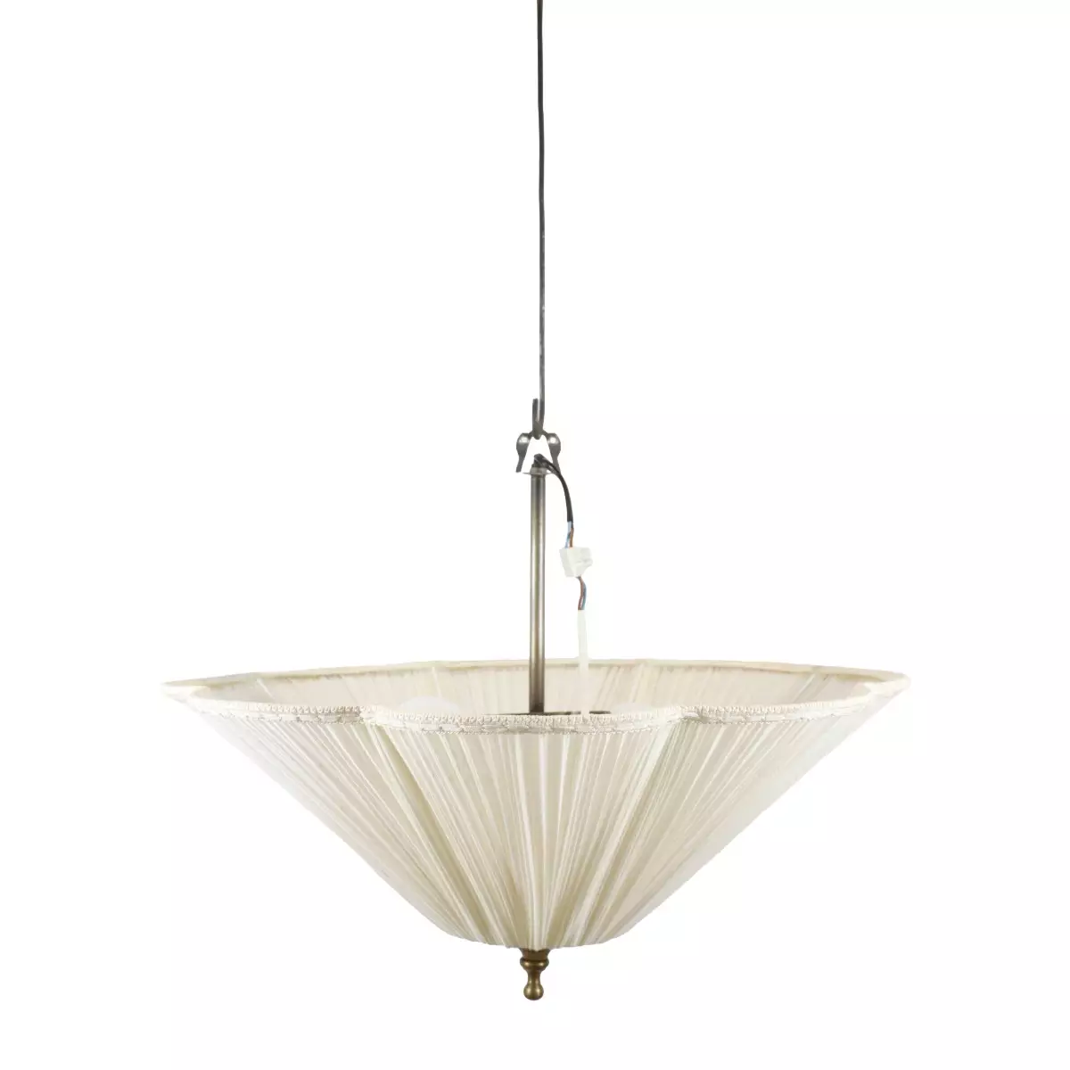 Vanha kankainen kattovalaisin, messinki koristeella. Väri: luonnonvalkoinen Kuvun korkeus 24cm ja halkaisija 47cm Lamppu: E27 x2 Testattu toimivaksi