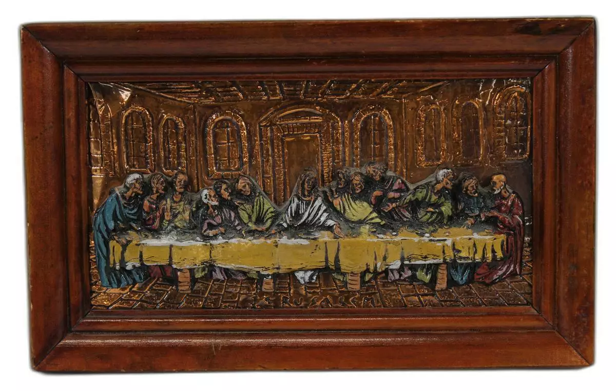 Viimeinen ehtoollinen veistostaulu. Taulussa tausta metallia, jonka päälle tehty kohokuvio veistos. Puukehykset. Mitat: 36cm x 22cm