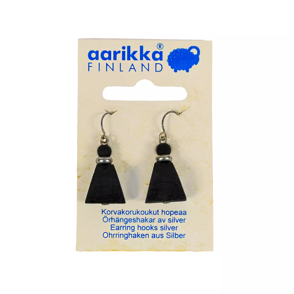 Mustaksi lakattua puuta, yksityiskohtana messinkirengas ja hopeiset koukut