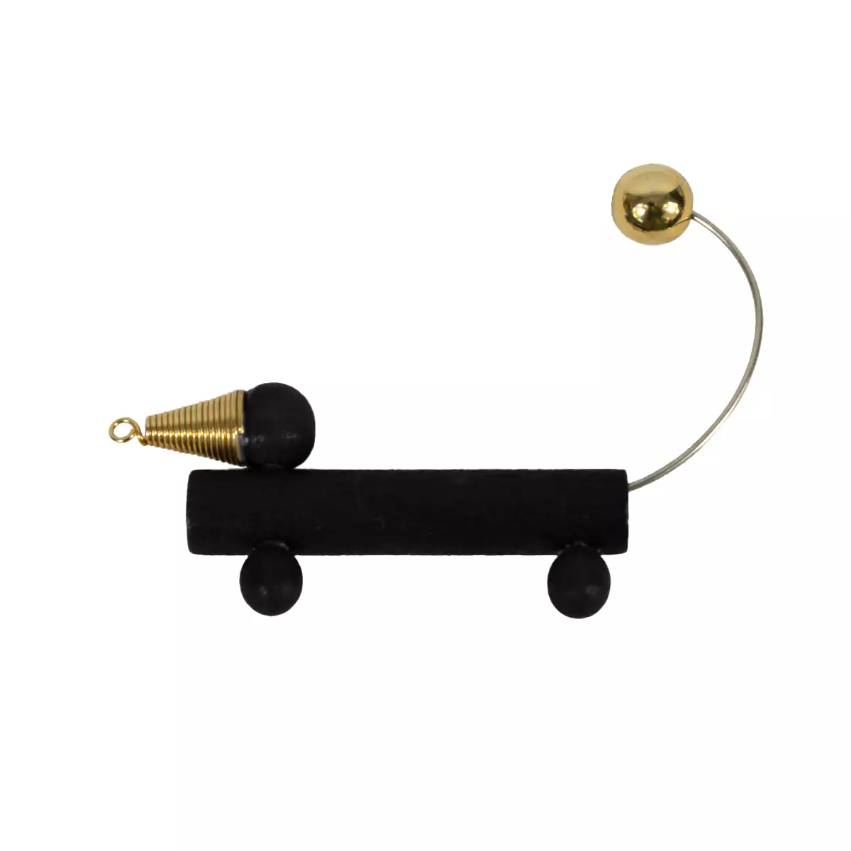 Valmistettu mustaksi maalatusta puusta ja siinä on metallinen häntä sekä kullanvärisiä yksityiskohtia