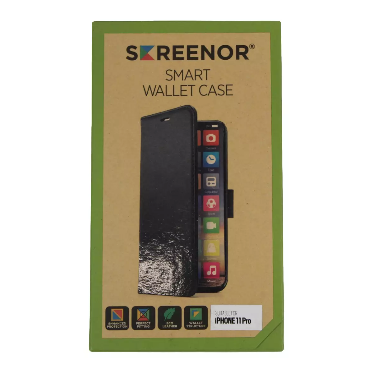 Valmistaja: Screenor Smart Malli: Iphone 11Pro Lompakkokotelo Väri: Musta Materiaali: Valmistettu ympäristöystävällisestä ekonahkasta