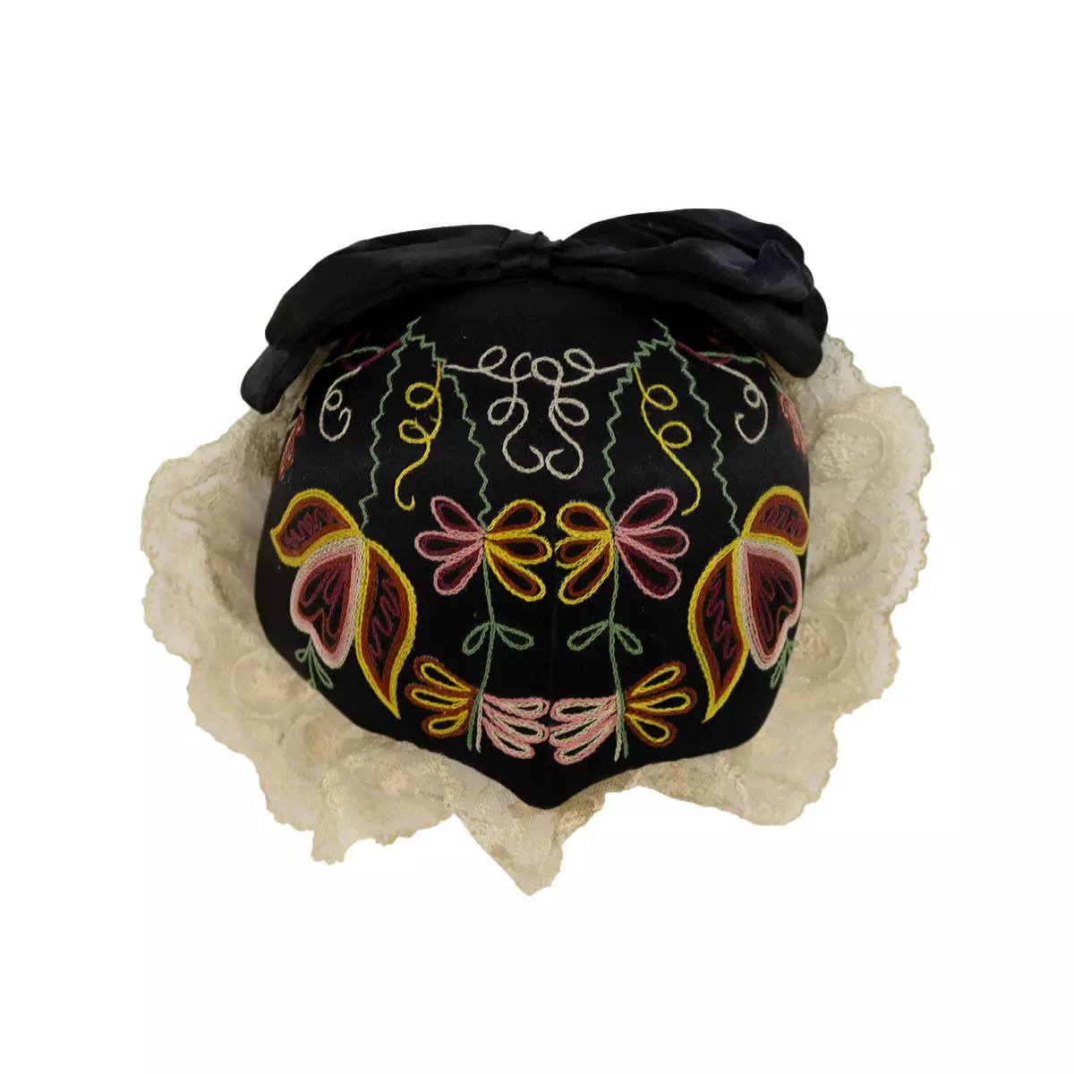 Kansallispuvun koppamyssy Myssy on mustaa kangasta ja siinä on värikkäitä kukkakuvioita esittävä villakirjonta sekä pitsireunus