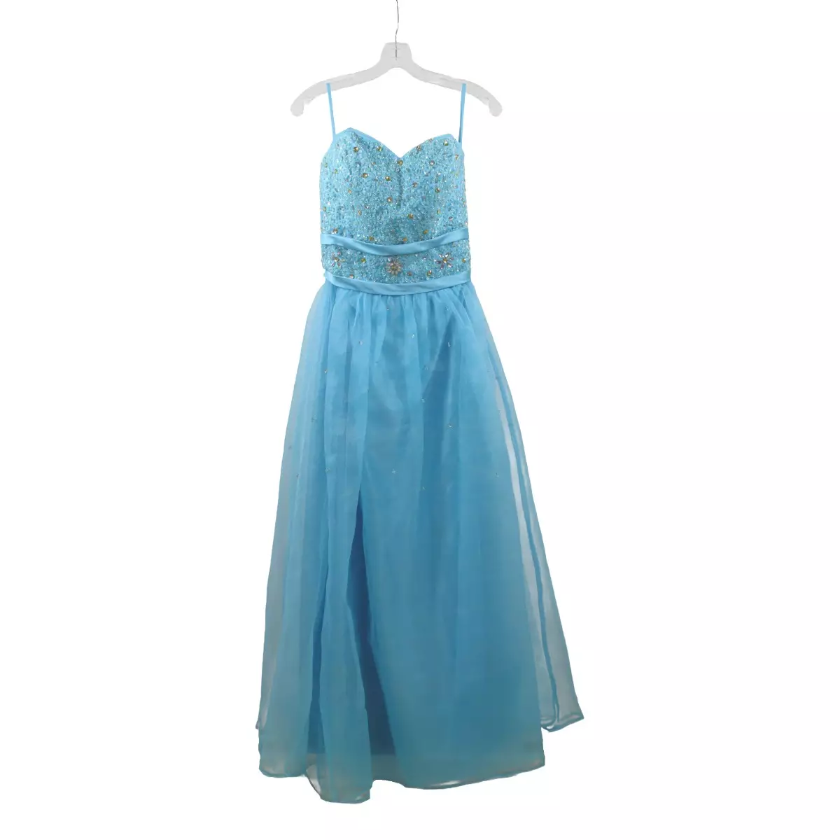 Paljeteilla koristeltu sininen pitkä juhlamekko. Koko: 36, S Pituus: 132cm