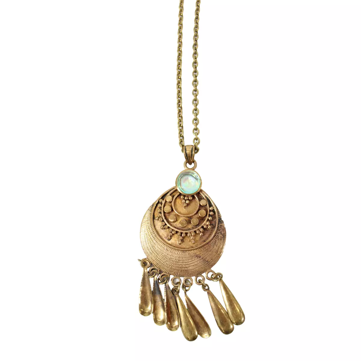Pronssinen kaulariipus turkoosilla kivellä. Pieni särö riipuksen reunassa.