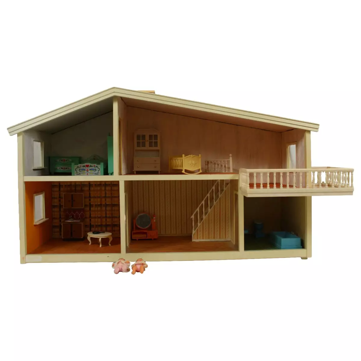 Vanha nukkekoti. Mukana tulee nukkeja ja kalusteita. korkeus 34cm leveys 68cm