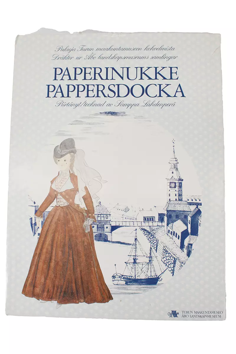 Paperinukke Pukuja Turun maakuntamuseon kokoelmista Pakkaus hieman revennyt