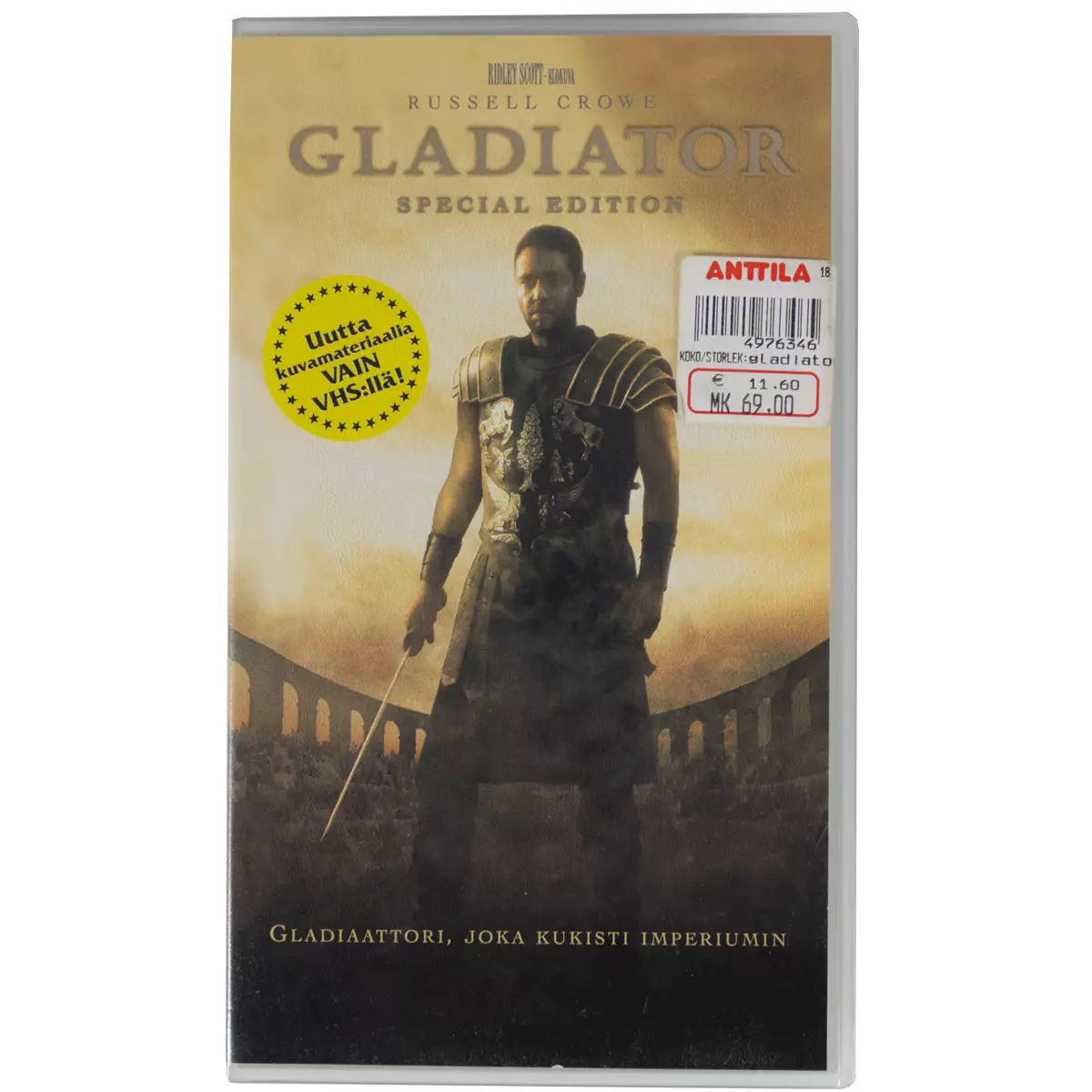 Gladiator VHS v. 2000 Toiminta Kesto: 2h 30min + 53min Elokuvan ääniraita: Englanti Elokuvan tekstitykset: Suomi Ikäraja: 16